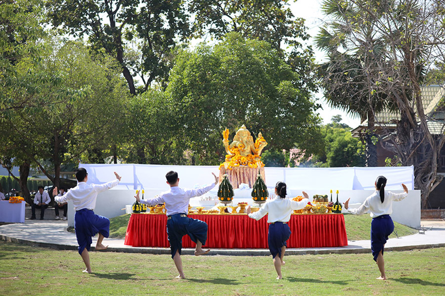 วันที่ 13 มกราคม 2566 ณ บริเวณลานด้านหน้าศูนย์ FTCDC ผศ.ดร.คณิศรา ธัญสุนทรสกุล อธิการบดี พร้อมด้วย คณะผู้บริหาร คณาจารย์ นักศึกษา ร่วมพิธีบวงสรวงและถวายเครื่องสังเวยองค์พระพิฆเนศ เพื่อให้เกิดความเป็นสิริมงคล ตามขนบประเพณี โดยมีคณะพระมหาราชครูพิธีศรีวิสุทธิคุณ (ชวิน รังสิพราหมณกุล) เป็นผู้นำประกอบพิธี