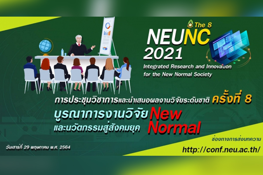 The 8th NEU National Conference 2021 (NEUNC2021) “Integrated Research and Innovation for the New Normal Society” การประชุมวิชาการและนำเสนอผลงานวิจัยระดับชาติ ครั้งที่ 8 เรื่อง บูรณาการงานวิจัยและนวัตกรรมสู่สังคมยุค New Normal ในวันเสาร์ที่ 29 พฤษภาคม พ.ศ. 2564 โดยใช้รูปแบบการประชุมวิชาการและนำเสนอผลงานวิจัยทางออนไลน์