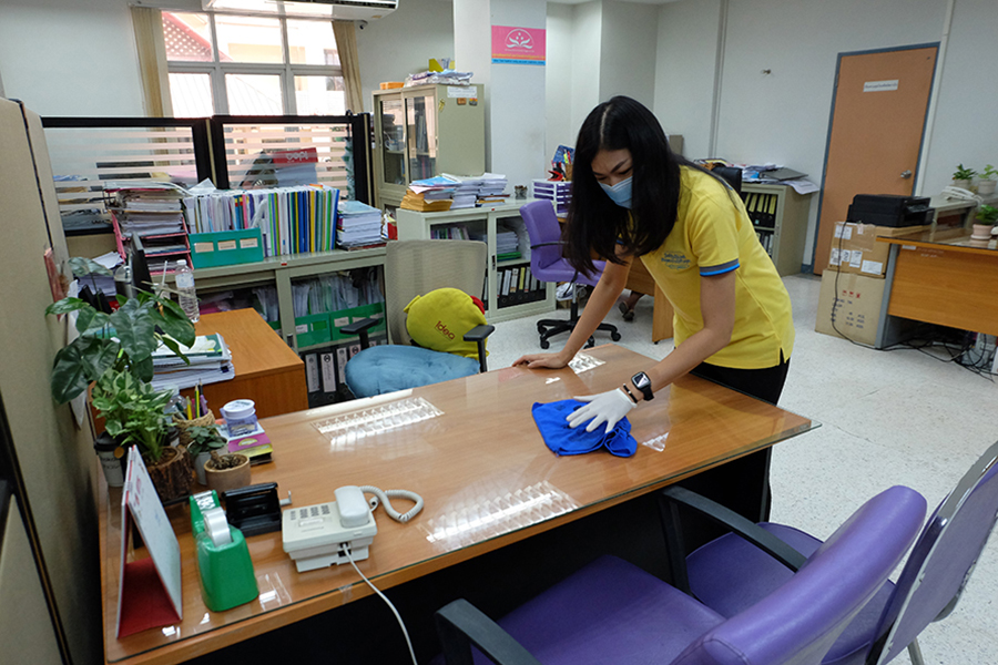 บุคลากรสำนักงานอธิการบดี ร่วมใจทำความสะอาดสำนักงานตามหลัก 5ส สร้างความมั่นใจแก่ผู้มารับบริการ “สำนักงานอธิการบดี 5ส สะอาดปลอดภัย ห่างไกลโควิด-19”