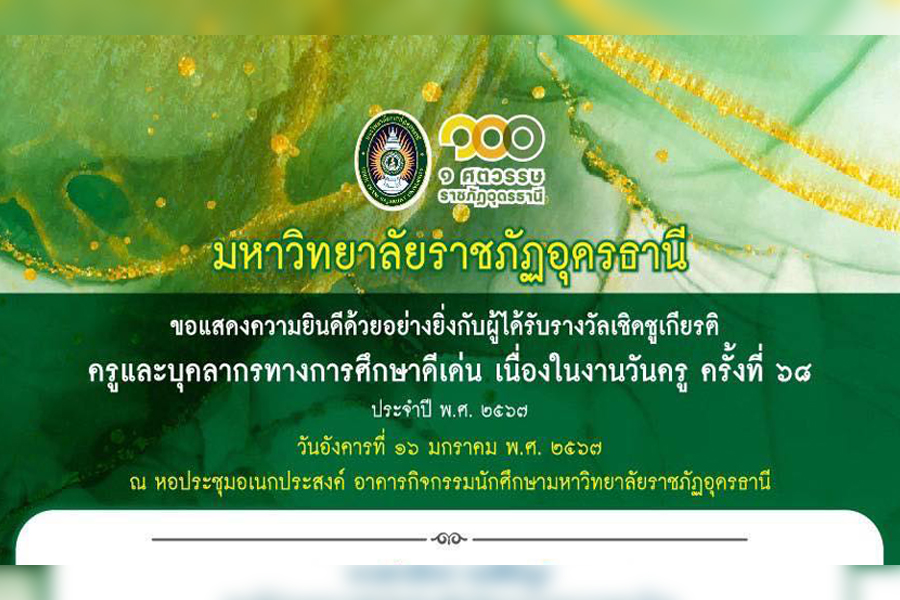 วันที่ 16 มกราคม 2567 ณ หอประชุมอาคารกิจกรรมนักศึกษา มหาวิทยาลัยราชภัฏอุดรธานี นายสุรศักดิ์ อักษรกุล รองผู้ว่าราชการจังหวัดอุดรธานี เป็นประธานในการจัดงานวันครู (ครั้งที่ 68) ประจำปี 2567