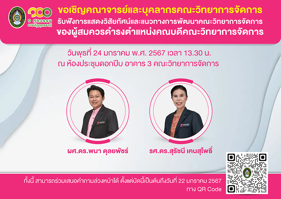 ขอเชิญคณาจารย์และบุคลากร มหาวิทยาลัยราชภัฏอุดรธานี รับฟังการแสดงวิสัยทัศน์และแนวทางการพัฒนาคณะวิทยาการจัดการ ของผู้สมควรดำรงตำแหน่งคณบดีคณะวิทยาการจัดการ