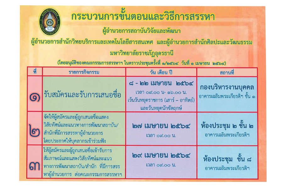 กระบวนการขั้นตอนและวิธีการสรรหา ผู้อำนวยการสถาบันวิจัยและพัฒนา ผู้อำนวยการสำนักวิทยบริการและเทคโนโลยีสารสนเทศ และผู้อำนวยการศิลปะและวัฒนธรรม มหาวิทยาลัยราชภัฏอุดรธานี