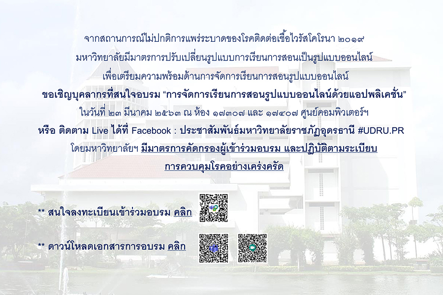 นายนิรัตน์ พงษ์สิทธิถาวร ผู้ว่าราชการจังหวัดอุดรธานี พร้อมด้วยส่วนราชการ และผู้แทนสำนักงานสาธารณสุขจังหวัดอุดรธานี ลงพื้นที่ตรวจความพร้อม การเตรียมสถานที่กักกันสำหรับ ผู้ที่เฝ้าระวังและสังเกตอาการจากไวรัส COVID-19 ซึ่งมหาวิทยาลัยฯ ได้ให้ความร่วมมือในการใช้พื้นที่ภายในมหาวิทยาลัย เป็น Local Quarantine ของจังหวัด สำหรับผู้ที่เดินทางมาจากต่างประเทศที่มีการระบาดของโรค ณ อาคารหอพักมหาวิทยาลัยราชภัฏอุดรธานี ซึ่งเป็นตึก 5 ชั้น สามารถจุผู้ป่วยได้ 524 คน ขณะนี้มีผู้เข้าพักที่ศูนย์ดังกล่าวแล้ว จำนวน 26 คน (ตัวเลข ณ วันที่ 11 เมษายน 2563)