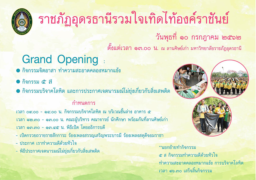วันที่ 10 กรกฎาคม 2562 ณ หอประชุมมหาวิทยาลัยราชภัฎอุดรธานี รศ.ดร.นสพ.ฤทธิชัย พิลาไชย รองอธิการบดีฝ่ายวิชาการ เป็นประธานในพิธีเปิดโครงการ GE Triple Game ครั้งที่ 1 โดยมีนายสวาท ศศิภาณุวัฒน์ นายกสโมสรโรตารี่บ้านเชียง ปีบริหาร 2562-2563 พร้อมด้วยสมาชิกสโมสรได้นำถ้วยรางวัลในการแข่งขันมาสนับสนุนให้แก่คณะกรรมการจัดการแข่งขันในครั้งนี้