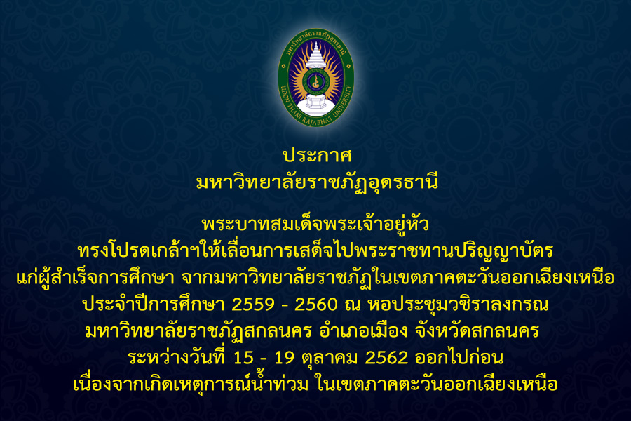 ด้วยจะมีงานพิธีพระราชทานปริญญาบัตร แก่ผู้สำเร็จการศึกษา ประจำปีการศึกษา 2559 - 2560 ในวันที่ 18 ตุลาคม 2562 ณ หอประชุมมหาวชิราลงกรณ มหาวิทยาลัยราชภัฏสกลนคร ในการนี้ มหาวิทยาลัยราชภัฏอุดรธานี จึงกำหนดให้บัณฑิตไปรายงานตัวฝึกซ้อมพิธีเข้ารับพระราชทานปริญยาบัตร ในวันที่ 1- 20 กันยายน 2562 ...